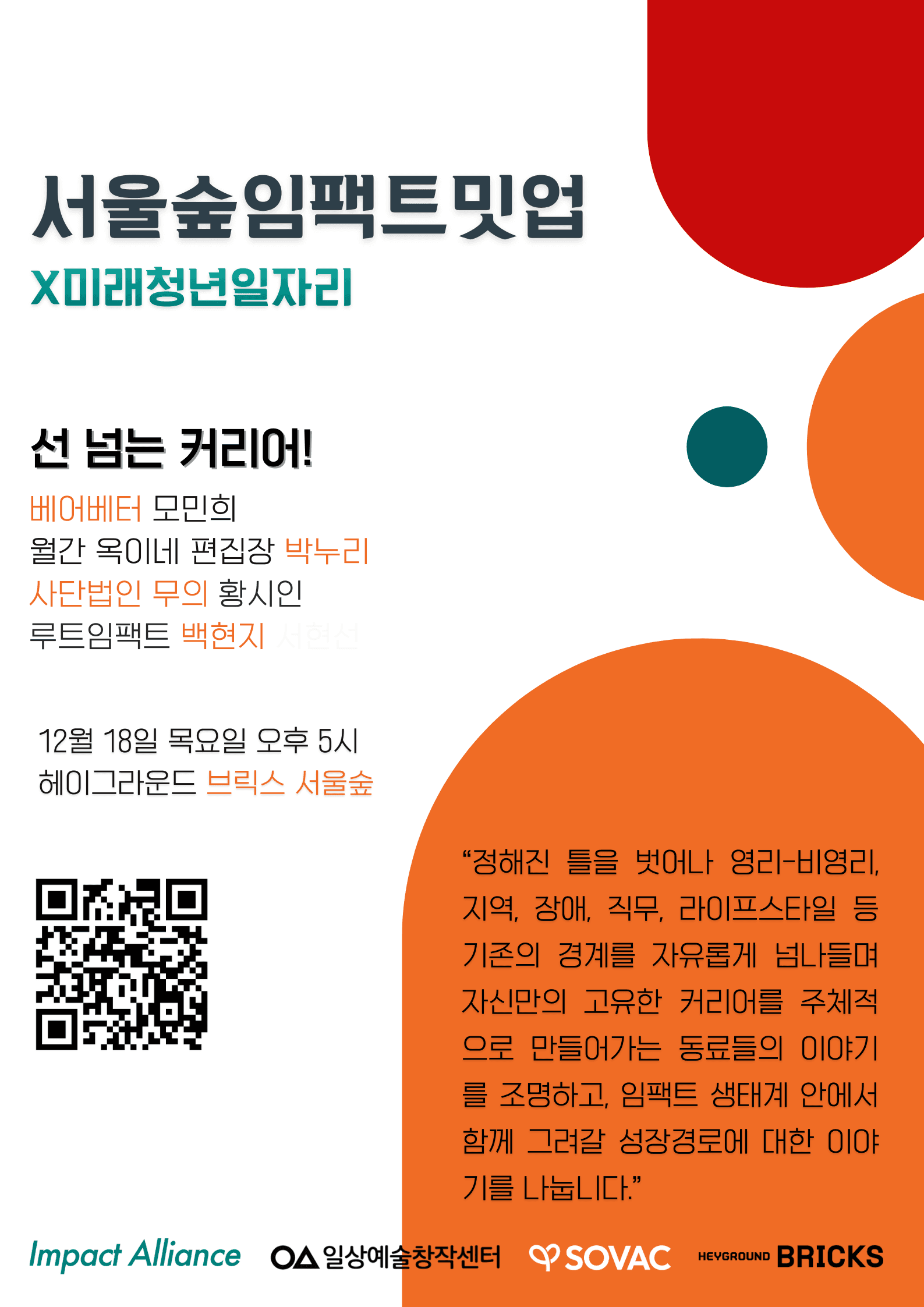 정해진 틀을 벗어나 영리-비영리, 지역, 장애, 직무, 라이프스타일 등 기존의 경계를 자유롭게 넘나들며 자신만의 고유한 커리어를 주체적으로 만들어가는 동료들의 이야기를 조명하고, 임팩트 생태계 안에서 함께 그려갈 성장경로에 대한 이야기를 나누고자 합니다.