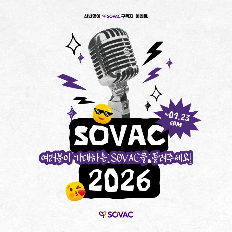 올 한 해 SOVAC 홈페이지에서 특별히 만나보고 싶은 키워드, 아젠다, 생태계 전문가 등이 있으시다면 가감없이 의견을 남겨주세요! 여러분의 의견을 적극 참고하여 2026년에도 알찬 인사이트로 가득한 SOVAC을 만들어나가겠습니다.